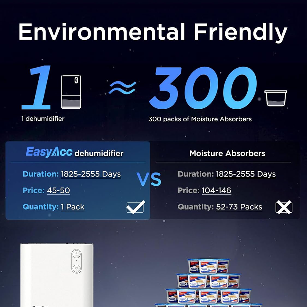 • Improved powerful dehumidifier: do you continually have problems with damp rooms, wet cabinets and floors? The dehumidification performance is better due to semiconductor cooling and powerful suction blower. It collects a maximum of 14 oz (400 ml) of water per day (at 86 °F / 30 °C, 80 % RH / relative humidity). Perfect for rooms from 50 to 320 ft² / 5 to 30 m²