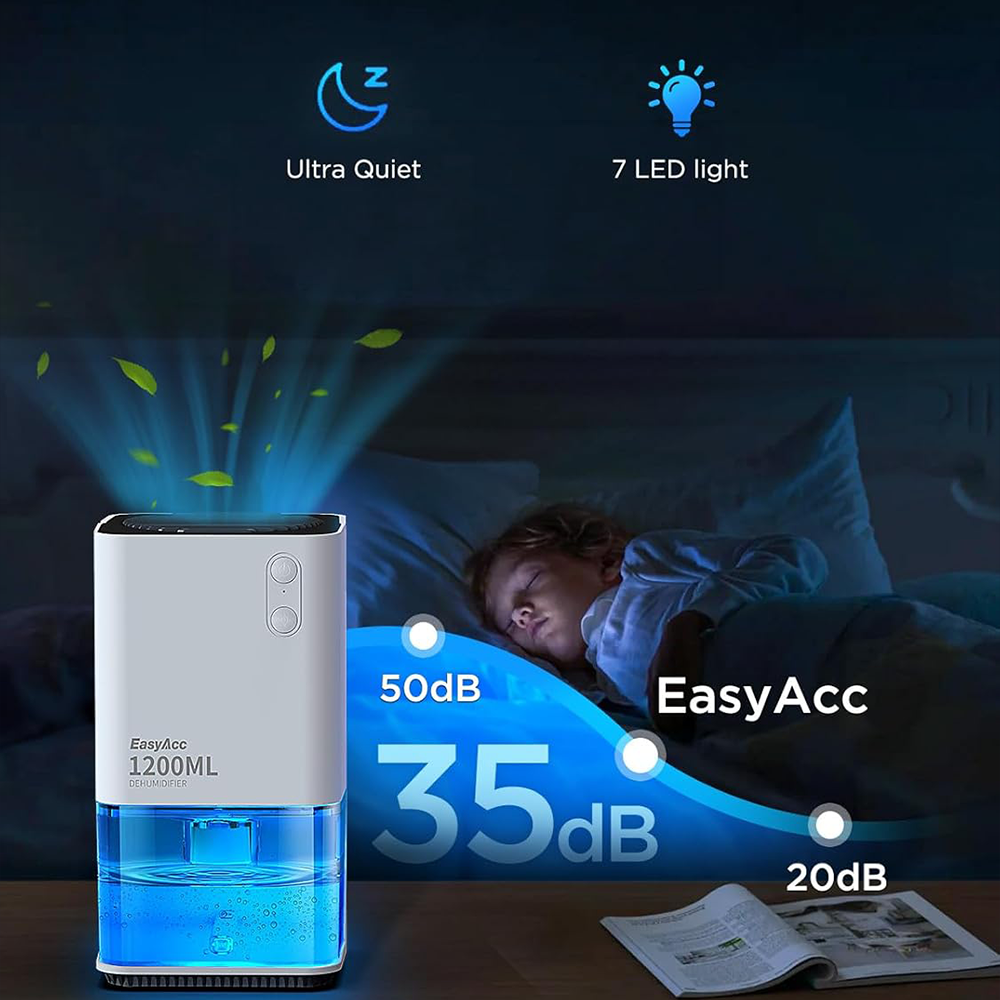 1200ml Mini Electric Dehumidifier – Ultra Quiet, Auto Shut-Off, 7-Color LED for Bedroom, Wardrobe, Bathroom, RV, White