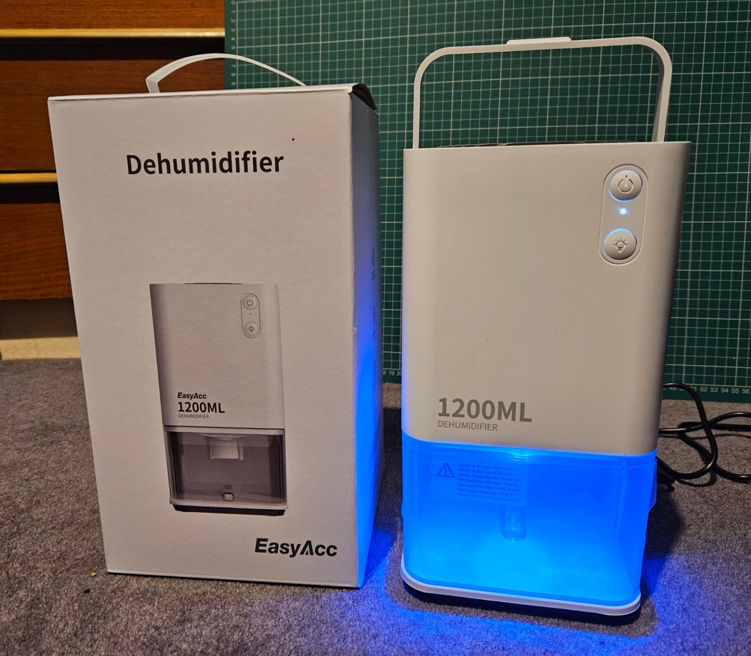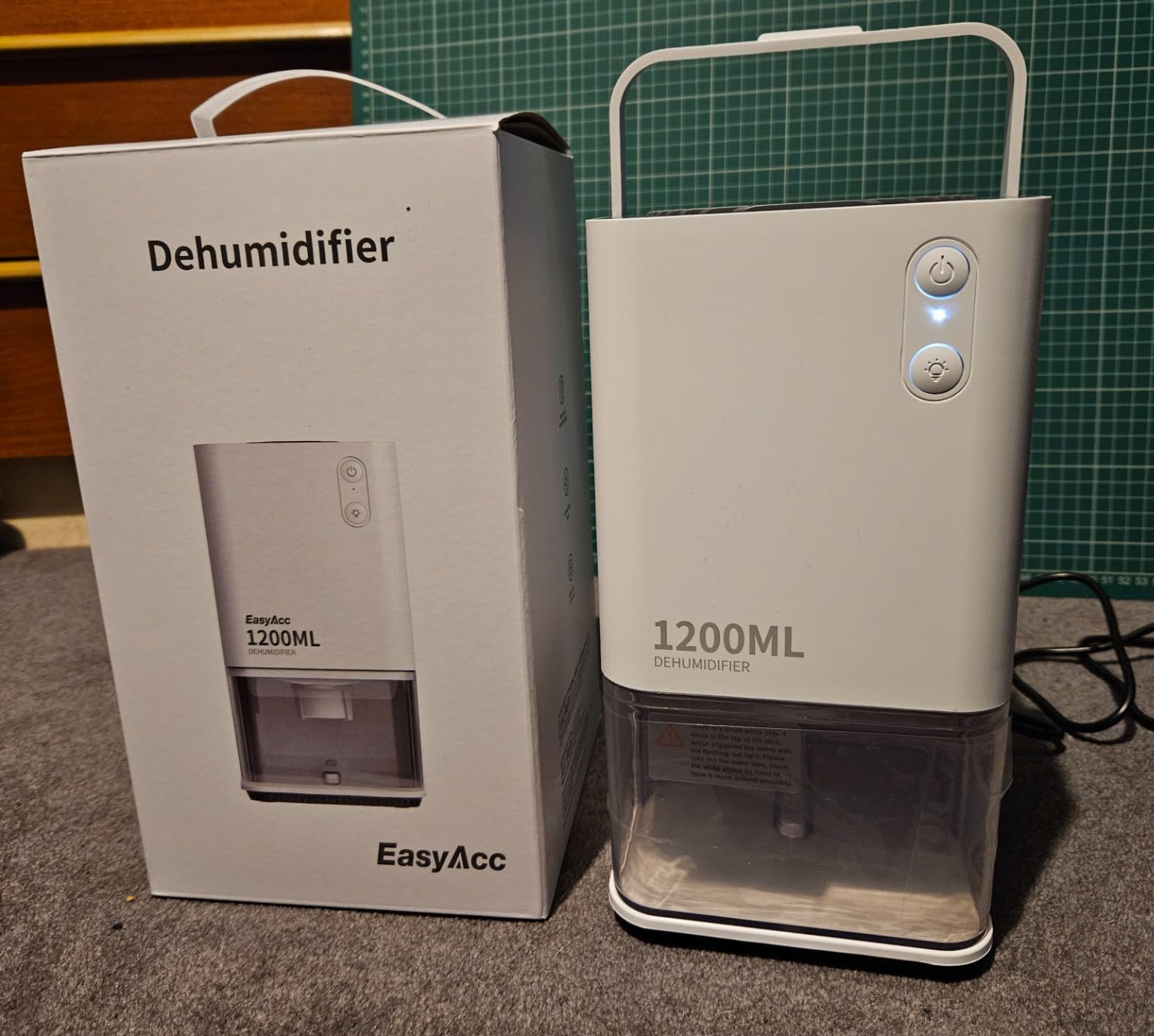 Really easy to set up, power cable/plug come tucked inside the water collection tray and it has a fold down carry handle that makes it simple to move. Power cable is about a meter in length, which does limit how far from a plug you can put it but it still has a good range. Water collection tray is super easy to empty