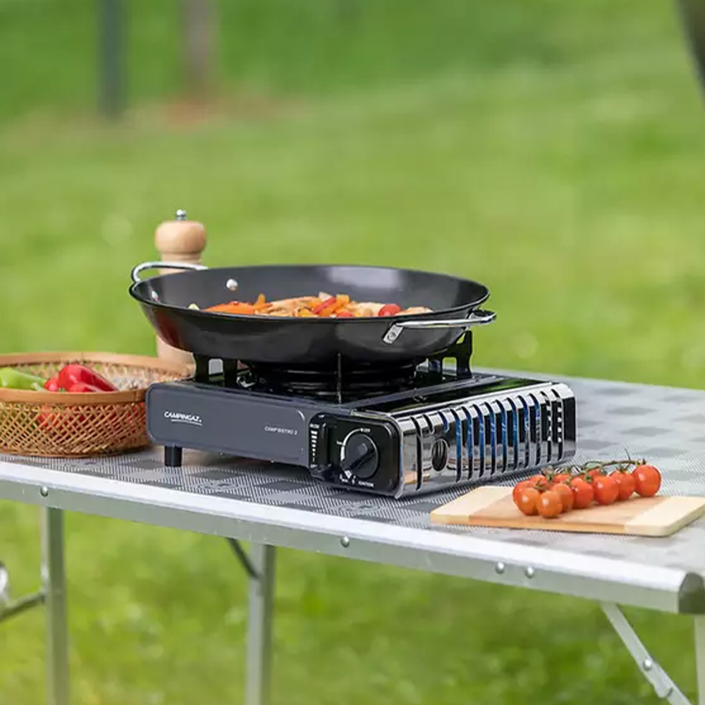The Campingaz Bistro stove is highly recommended for camping. It outperforms the Go system as it allows better control over the flame. The stove is stable with pans and kettle, making it convenient for cooking.