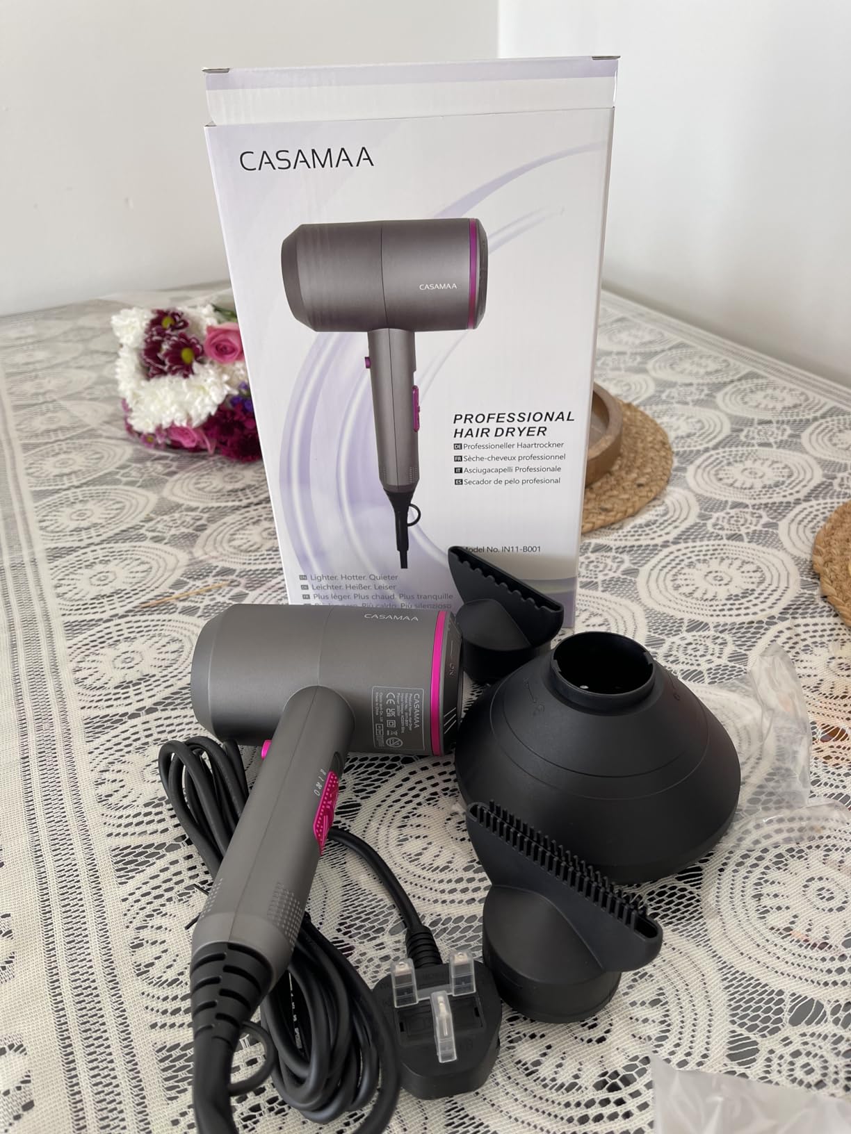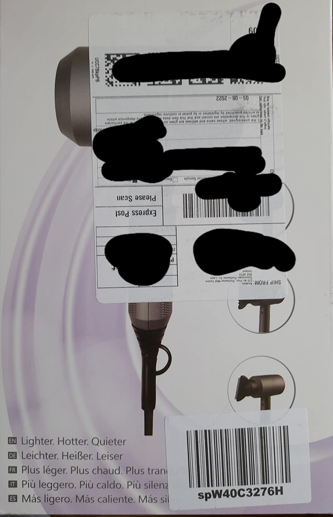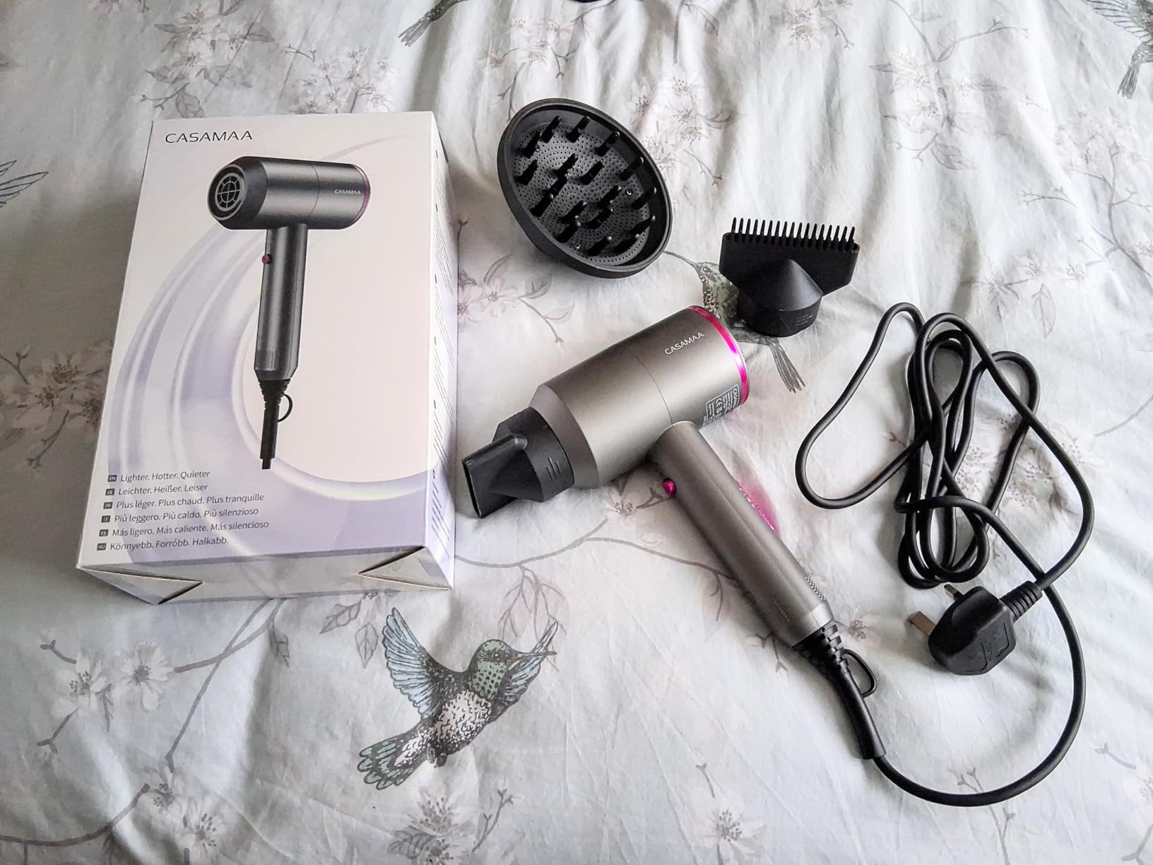 Arrived so quickly, was well packaged and each individual piece was wrapped so no damage. Used a few times now and I am so pleased with how fast it dries without making my hair frizzy, has several settings and three attachments which are easy to put on and take off and is so very powerful with no overheating smell.