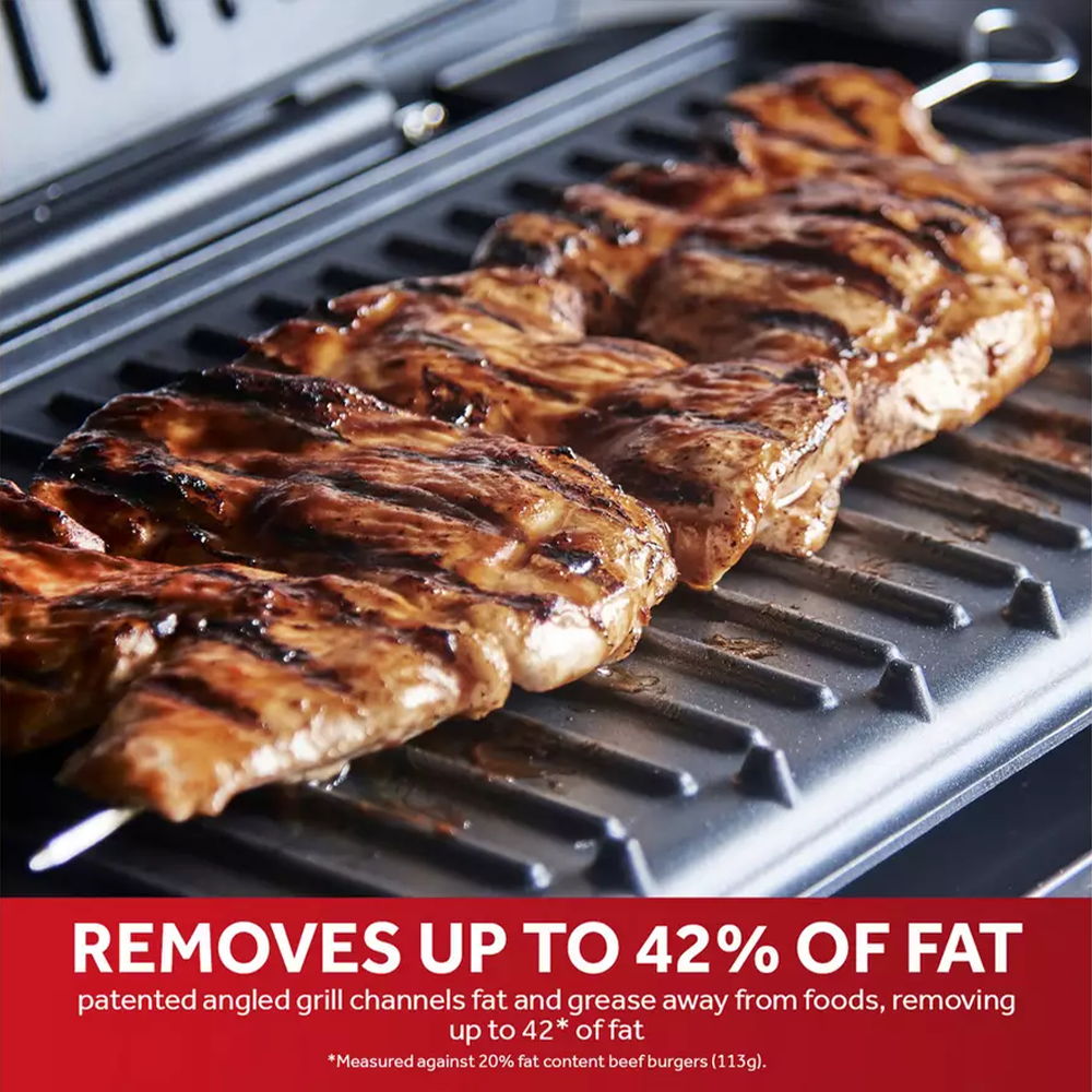 - Sloped grill so oil or fat can drain easily and drip tray to collect the oil and fat.