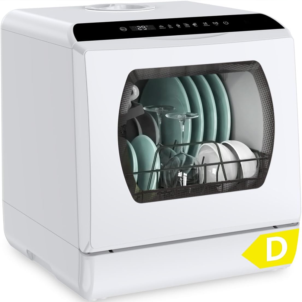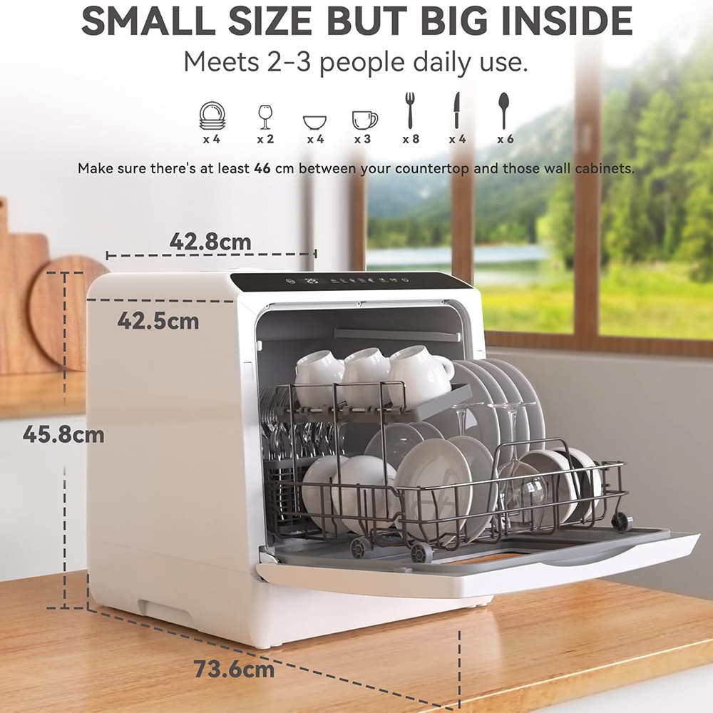 • 【5 - Piece Capacity】This space-saving tabletop dishwasher (42.5W × 42.8D × 45.8H cm) holds up to 5 place settings, accommodating items up to 25cm in length. Its compact footprint make it ideal for small kitchens.