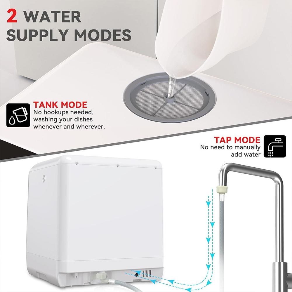 • 【No Installation Required】This tabletop dishwasher no plumbing supports dual water supply modes: Tank Mode: 5L built - in water tank Tap Mode: Quick - connect hose included