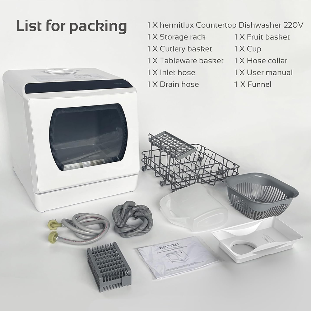 Hermitlux Table Top Dishwasher – Compact 5 Place Settings with 5L Tank, No Plumbing Needed, 6 Wash Programmes & 360° Spray Arms