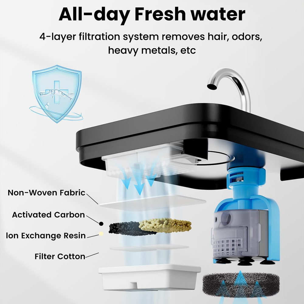 Quadruple Filtration System: The cat water fountain features an enhanced filter that effectively filters out hair, dust and other impurities, eliminates odors and softens the water to provide your pet with fresh, pure water