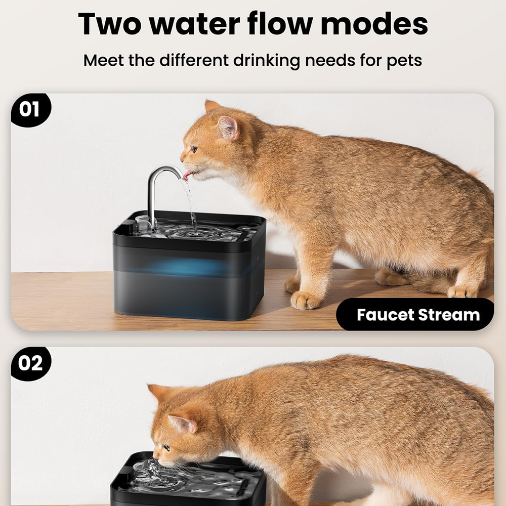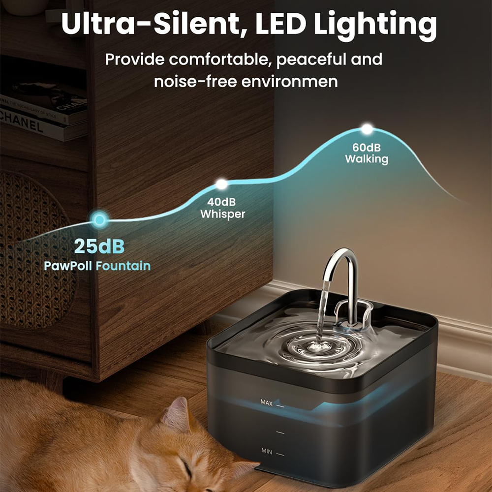 Super Quiet: The cat fountain features an upgraded motor, energy-saving and eco-friendly 1.5W water pump, which is super quiet (≤ 25dB) and ensures that you and your cat can enjoy a peaceful night's sleep